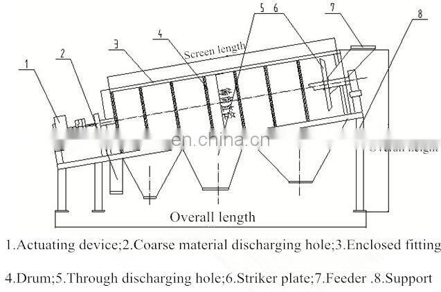 The drum mesh device is installed on the rack at an angle. The motor is connected to the roller device via a reducer through a coupling, and drives the roller device to rotate around its axis. When the material enters the roller device, due to the inclination and rotation of the roller device, the material on the screen surface is turned and rolled, so that the qualified material (the product under the screen) is discharged through the outlet at the bottom of the rear end of the drum Upper product) is discharged through the discharge port at the rear of the drum. Due to the turning and rolling of the materials in the drum, the materials stuck in the screen holes can be ejected to prevent the screen holes from being blocked.