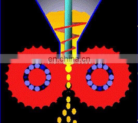 The materials are pressed into the pre-press device of the briquette machine with certain volume evenly when working, and the stable material position shall be kept in the pre-press device. The pre-pressing spring in the device will force the materials into the inter-space between the double rollers, then the materials shall be pre-pressed and transited to the arch groove of the pair-rollers. The roller pits with the same shape are distributed evenly on the roller surface. The 2 pair-rollers shall rotate at constant speed reversely through engagement drive. The rollers will suck the materials at the entry into the groove and forcibly compress them. With the continuous rotation of the pair-roller, the ball shall be taken off by the elastic force and gravity. The roller rotates to compress and form the materials periodically with the continuous operation of the motor to realize the batch production.