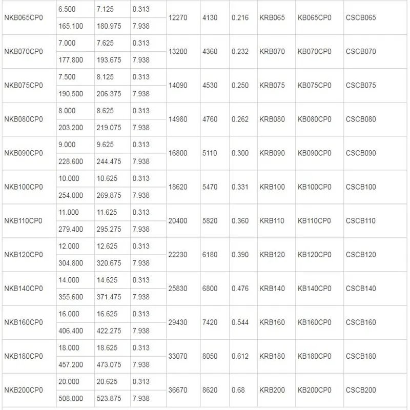 KB050CP0 ultra thin section radial contact deep groove bearings 127 x 142.875 x 7.938 mm, Thin Walled Bearing KB060CP0 With Cross Section 5/16 x 5/16 inch, id: 5 inch, OD:5.625 inch, Size: 5 inch x 5.625 inch x 0.3125 inch. KB050CP0 Radial contact ball bearing belongs to KB SERIES of thin section ball bearings, the KB SERIES include KBCP0, KBXP0 and KBAR0,which represented : Type-C : Deep Groove bearing, Type-X: Four Point Contact bearing and Type-A: Angular Contact bearing, the rolling body of these bearings is ball, which can be nylon ball or steel ball as requested. The bore size of KB SERIES are ranged from 2 inches to 20 inches and the outer diameters are arranged from 2.625 inches to 20.625 inches, while the Cross Section is constant, that is 0.3125 inch.