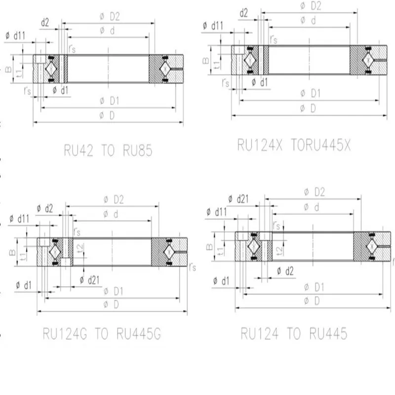 RU type (The outer ring and inner ring are high rigidity and integrated), Due to the outer ring and the inner ring have mounting holes, RU Series Cross Roller Bearings do not need to fix the flange and support seat during installation., and because the outer ring and the inner ring are in integral structures, the installation will not have any impact on performance, so it can obtain stable rotation accuracy and torque, and can be used in situations where the outer ring and inner ring rotate.