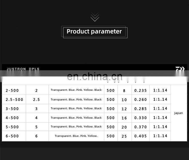Single product weight | 2# 8LB 0.235mm 500m 2.5# 10LB 0.26mm 500m 3# 12LB 0.285mm 500m 4# 16LB 0.33mm 500m 5# 20LB 0.37mm 500m 6# 25LB 0.405mm 500m | |