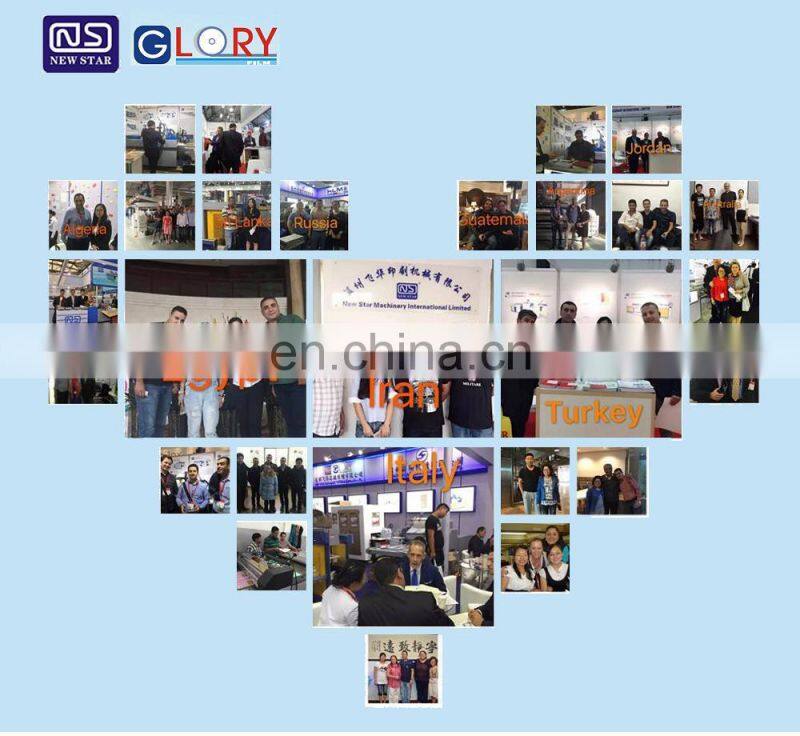 New Star Machinery international Limited And glory packing material produce kinds of laminating machine and uv coating machine and BOPP Thermal film metallizde PET And 3D , Soft touch film . With the development and innovation of post-press equipments, our company has carried on deep research and development to post-press equipments combining the features of printing & packing industry home and abroad. The products occupy sizable market at home and also have been expanded to all over the world.