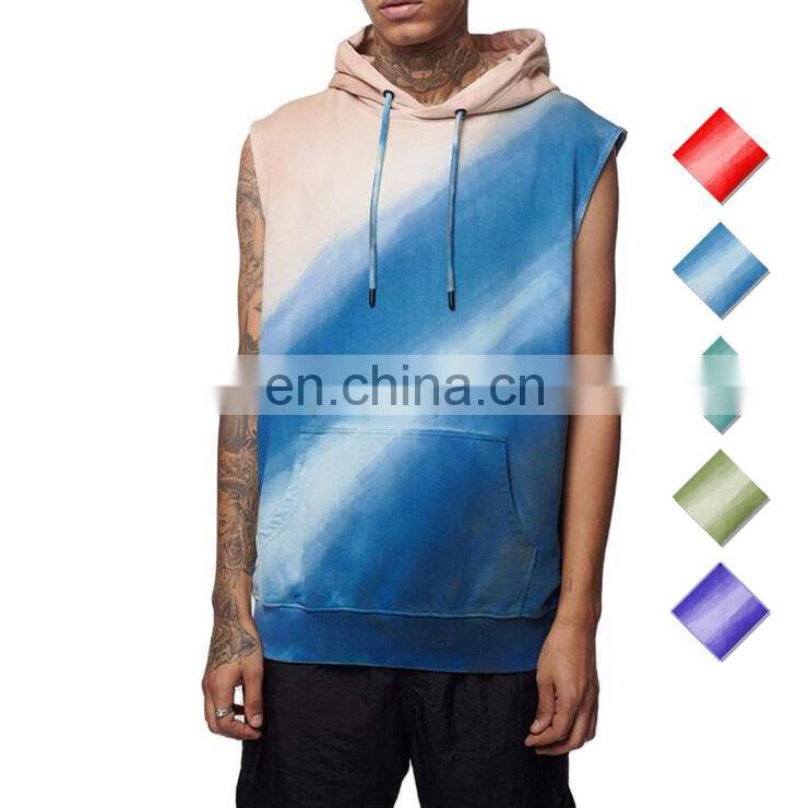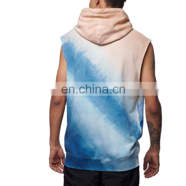 Men's Sleeveless Hoodies Custom Cotton Drawstring Blue Tie Dye Sleeveless Pullover Hoodie
