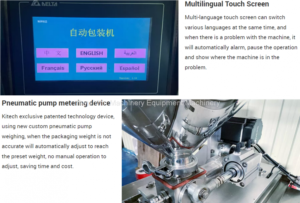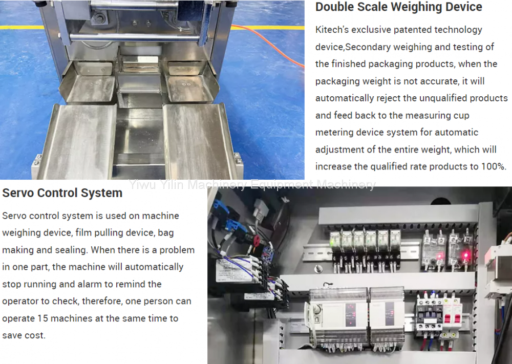 1. This machine can finish : forming bag--measuring--material filling—sealing—counting—date code printing, all the work automatically;