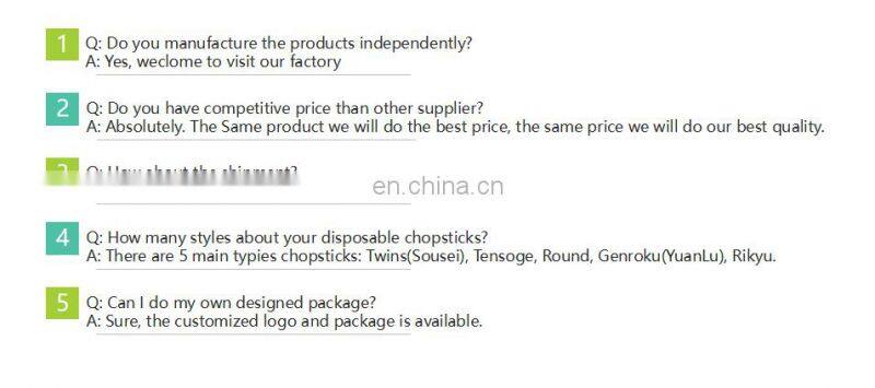 Package | 1. Naked/ Half Paper/ Whole Sealed Paper/ Whole Sealed OPP/ Plastic Packing for each pair of chopsticks. 2. 100 pairs/PE bag 20-30 bags/carton (regular packing) 3. Personified design and LOGO are workable. |