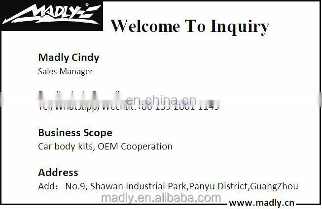 GUANGZHOU MADLY AUTO MODIFICATION PARTS CO., LTD is proudly praised in the world as one of the aerodynamic manufacturers in industry in Asia since our inception in 2002. We also provide OEM service for world-renowned brands. With over 20 distributors all over the world, Madly adopts Germany technology and equipment to produce high-level auto body kits, we are mainly focus on developing body kits for BMW,PORSCHE,BENZ,AUDI, FERRARI,LAMBORGHINI and BENTLEY , and only produce high quality products with top manufacturing technology research and development in the world, such as our production lines of dry carbon which is used in aviation sector,PP,PU,FRP which grow faster and faster constantly. Madly Body Kits , as the highest products in China, is consistent Germany-Level quality with reasonable price, and to meet the needs of high level products and better price and service are always our objective.Welcome to join our Madly,We look forward to cooperating with you in the future,and wish to have a better development together in the future.