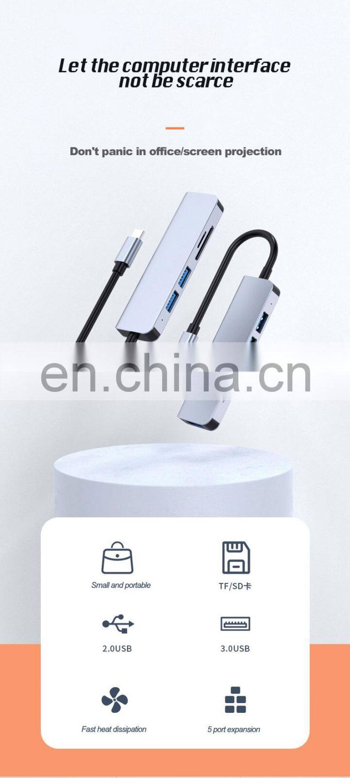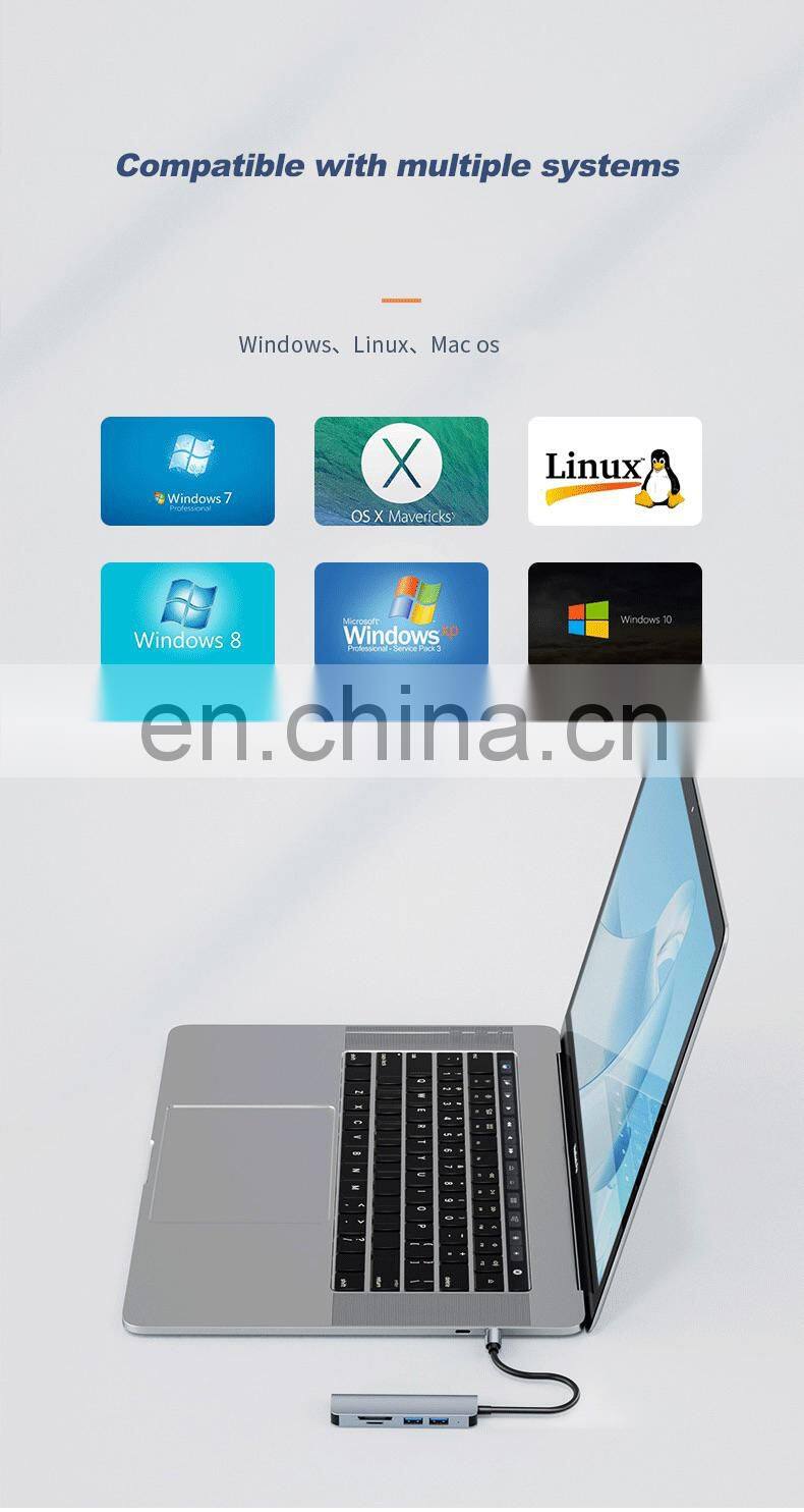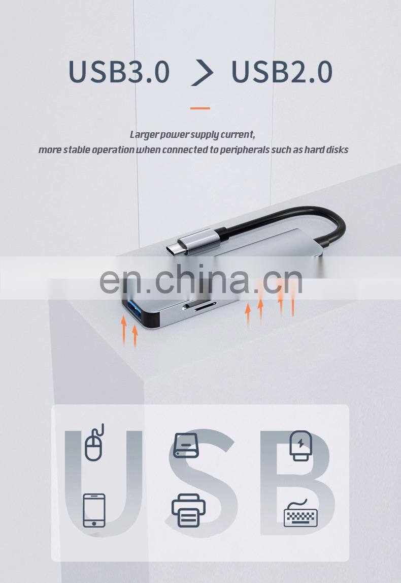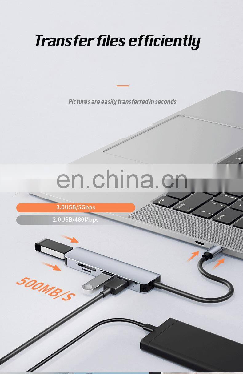 Home > Products > USB HUB > Multifunction 5 ports usb hub Type C to USB3.0+ USB2.0*2+TF +SD 4K 60HZ type c hub adapter laptop docking station