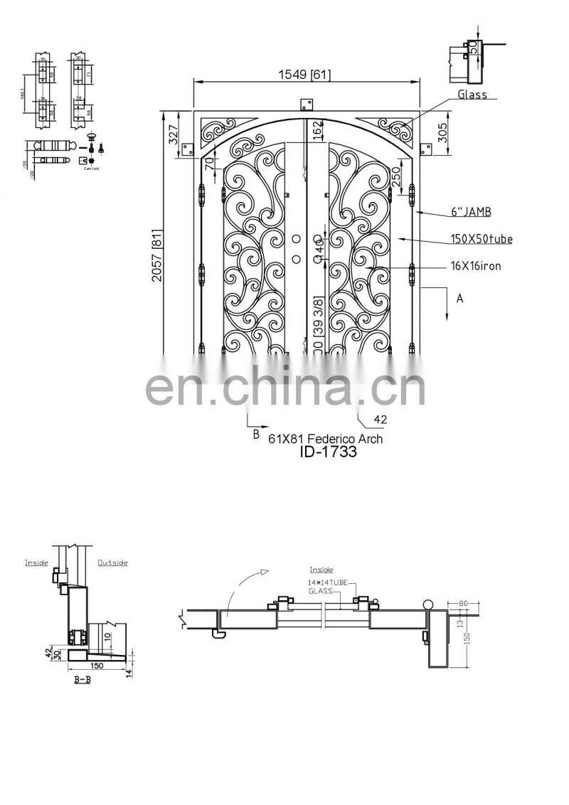 House Entry Big Double Glass Arched Eyebrow Top Black Cast Iron Frame Unique Scrolls Heavy Duty Front Design Wrought Iron Door