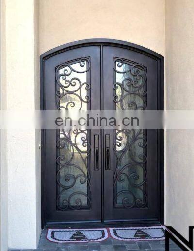 Unique House Entrance Exterior Strong Frame High Security Arched Round Top Tempered Glass Front Entry Wrought Iron Double Doors
