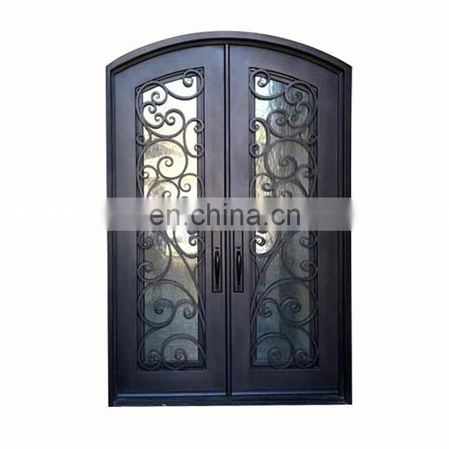 Residential Luxury Security Entrance Steel Arches Design Safe Glass Swing French Front Wrought Iron Double Entry Doors for Sale