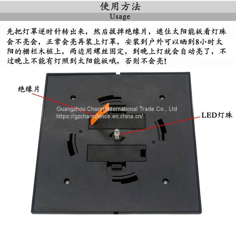see if the light beam will light up or not. normally it will light up. when it is light up, put on the light cover. put it to fix on the column of the fence, then fix two side by bolt nailing on, when at night it will light up. please remember