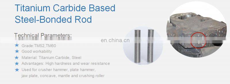The titanium carbide cermet rod(TiC rod) belongs to the steel-bonded cemented carbide, which is a kind of compound material based on the steel as the binder phase and used the refractory metal carbide(mainly the titanium carbide and the tungsten carbide) as the hard phase. The TiC rod is the high-hardness and high-strength titanium-based alloy composite material. The main varieties of steel-bonded cemented carbide included the tool, mold and wear parts (grade: GT35, R5); the mining tools and hammer head alloys (grade: TM52, TM60, GB10). Among them, the GT35 used as a guide wheel and the TM52&TM60 used as crusher hammer head insertt have extremely broad development prospects.