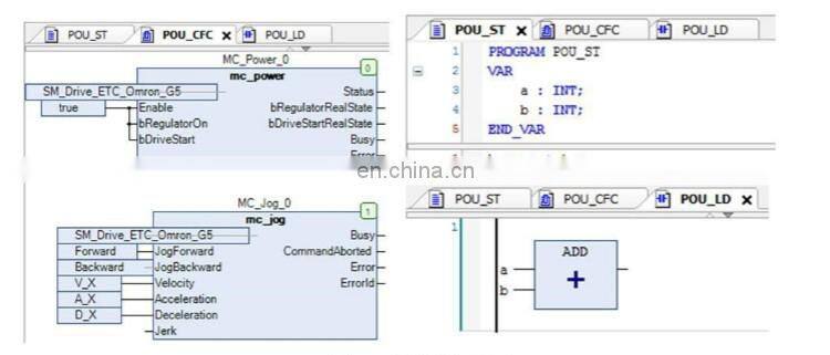 The development software adopts CoDeSys developed by German 3S company. CoDeSys is based on the programming specification of IEC61131-3 and supports six programming languages such as CFC, st and FBD. The figure shows the programming language interface of CFC, st and LD