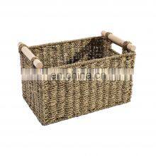 Wholesale Large Capacity Woven Rattan Basket Hand-Woven Storage Baskets With Wooden Handles, Seagrass Wicker Baskets