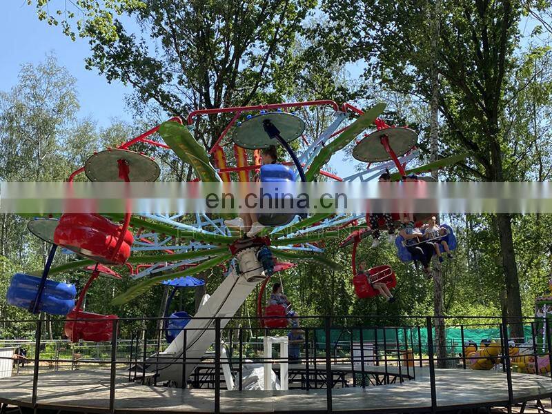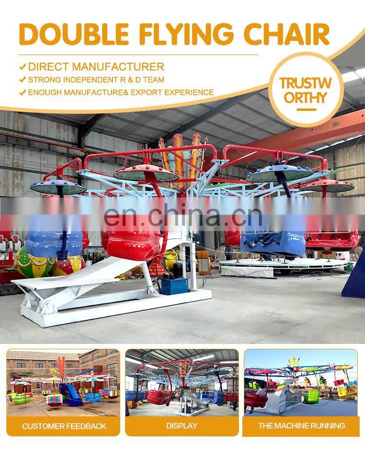 Double flying rides is a rotating amusement equipment. Each cabin can take two person sit in the cabin, the machine will rotate, meanwhile, lift up and down, passenger will feel like flying in the sky. Both kids and adult can enjoy it!