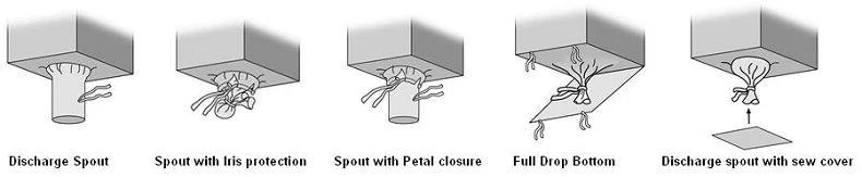 1.Spout Bottom: Spout bottom bulk sacks have a spout on their bottom that is used to empty whatever product the bag is holding. The most common dimensions for a spout on the bottom of a bulk bag are the same as the ones used for a spout on the top of a bulk sack.