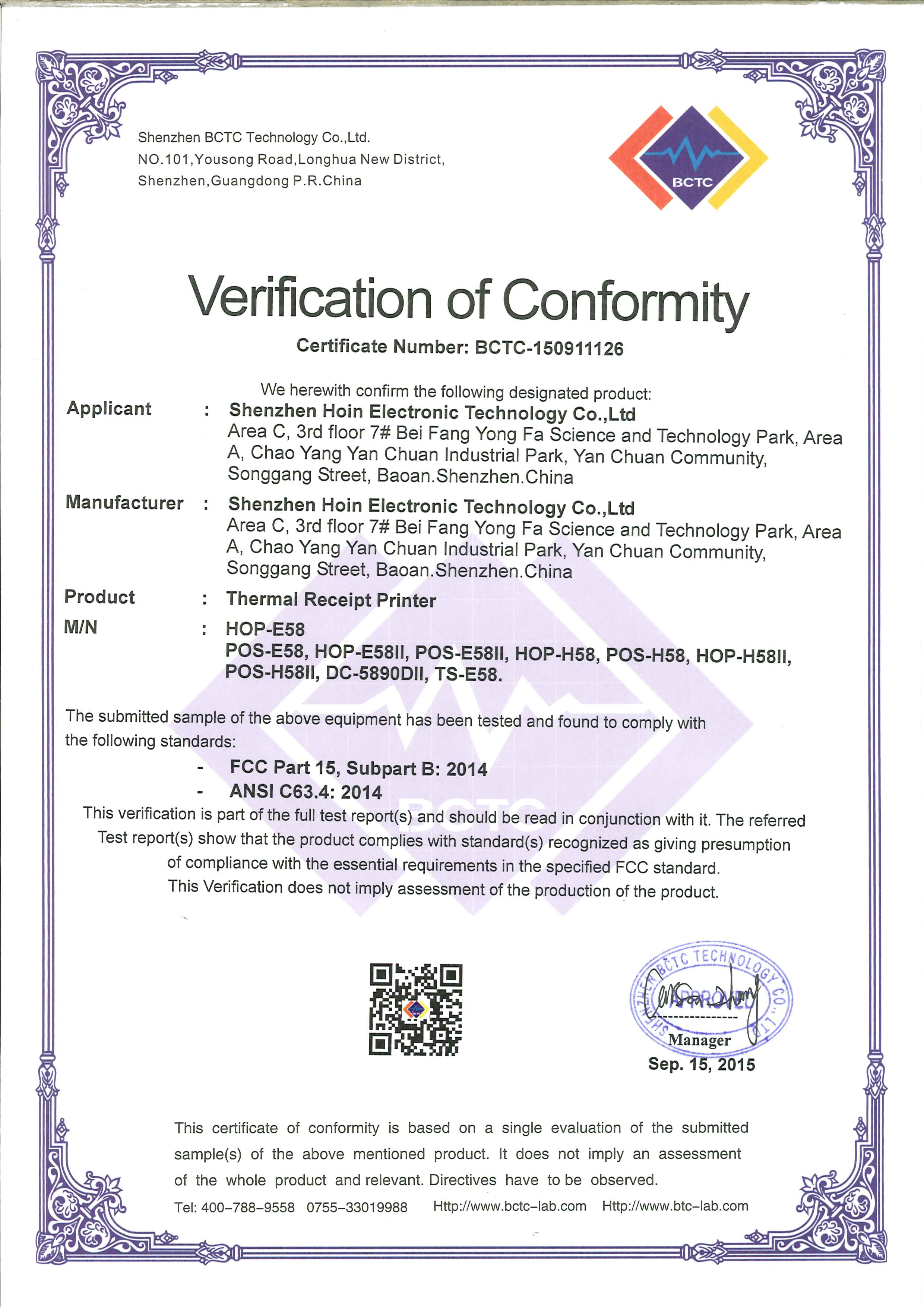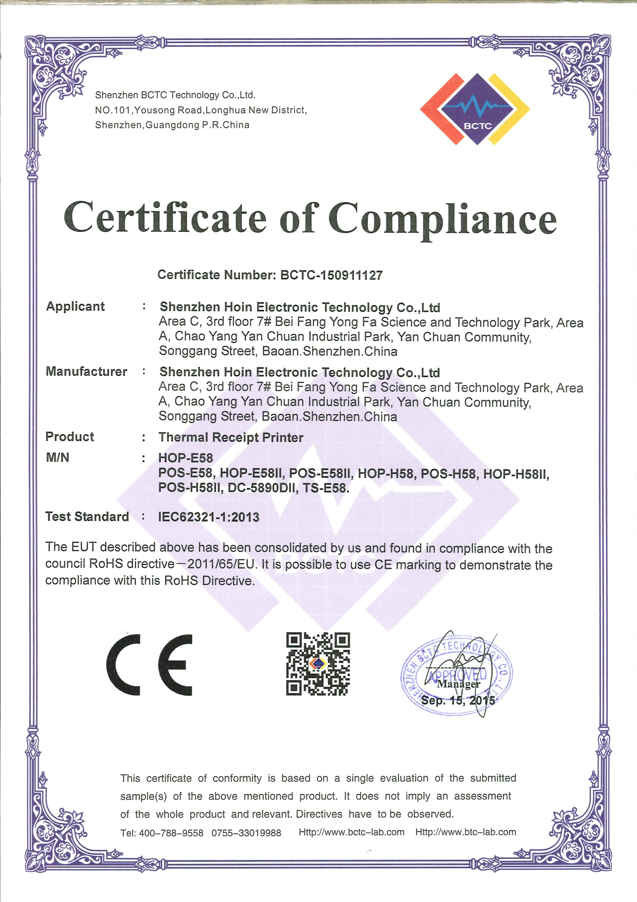 Most of our thermal receipt printers are CE, CFF, RoHS,BIS,CB,CCC certified.