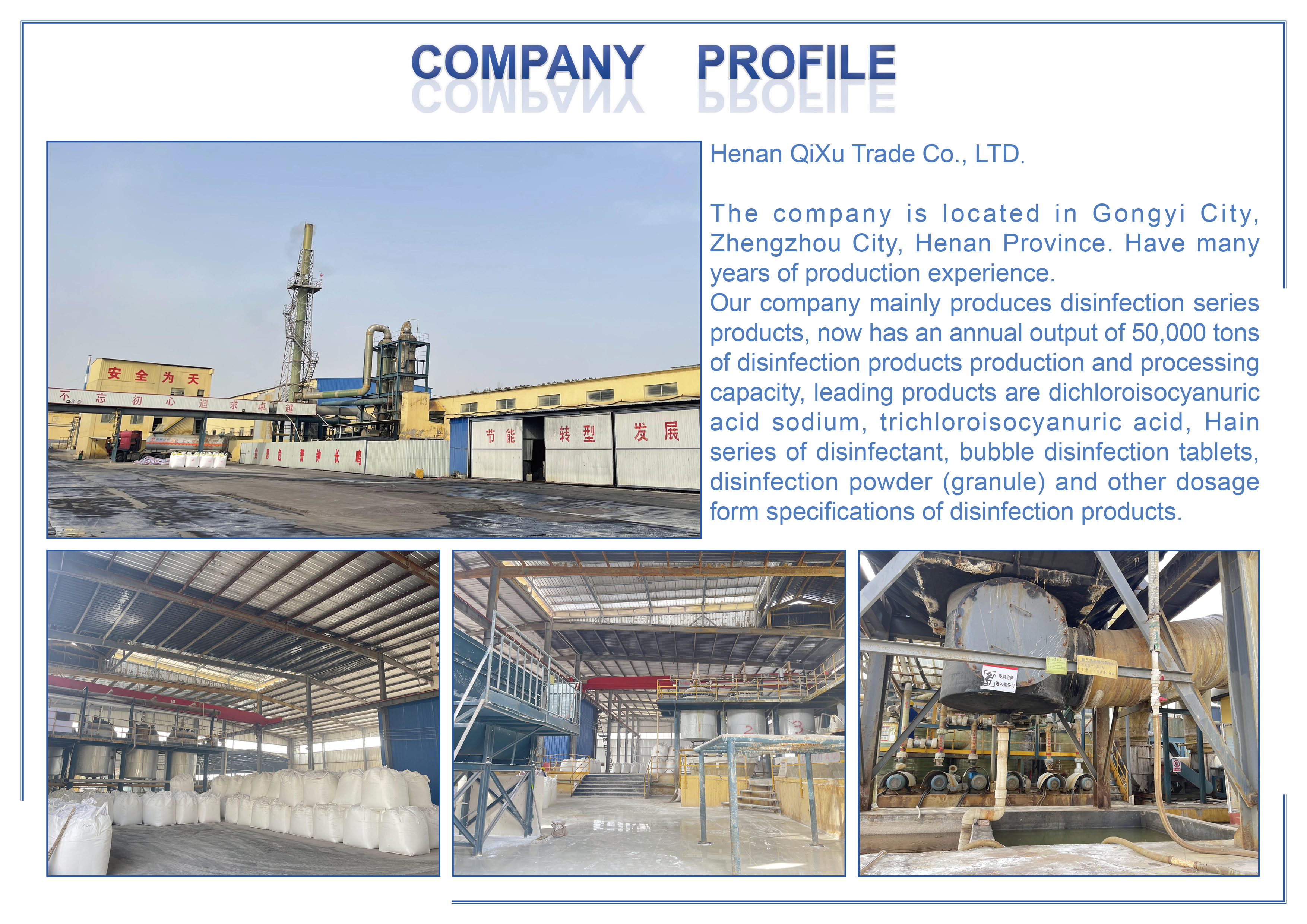The company is located in Gongyi City, Zhengzhou City, Henan Province. Have many years of production experience.Our company mainly produces disinfection series products, now has an annual output of 50,000 tons of disinfection products production and processing capacity, leading products are sdic,tcca,clo2 series of disinfectant, bubble disinfection tablets, disinfection powder (granule) and other dosage form specifications of water treatment products. Disinfection products are mainly used for sterilization, disinfection, water purification, bleaching, algae killing, deodorization, has been widely used in health and epidemic prevention, food processing, animal husbandry and aquaculture, wool shrinkage prevention, industrial water treatment, swimming pool water treatment, urban sewage treatment, environmental disinfection, rubber chlorination and other industries. Our company has independent import and export rights, products are exported to more than 40 countries in the world.