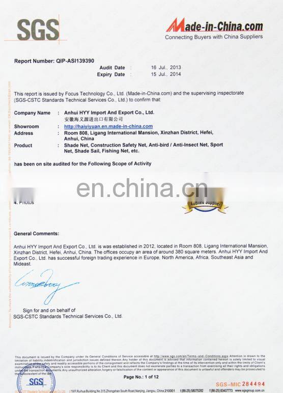 HYY factory specializes in producting safety net ,shade net,HDPE shade sail ,Waterproof shade sail ,Privacy screen fence net ,debris netting ,scaffolding safety net ,anti bird net ,anti hail net ,anti bee net ,anti wind net etc used for different arean for example agriculture ,building etc all kinds of plastic net .