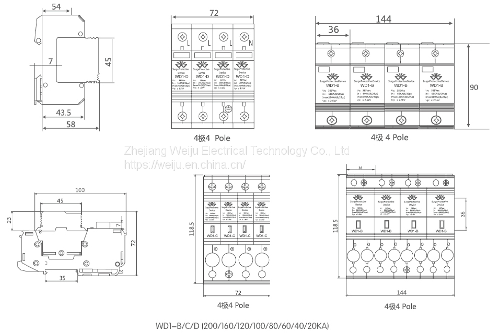 WD1 series surge protector (hereinafter referred to as SPD) is applicable to T, TT, TN-C, TN-S, TN-C-S and other power supply systems with AC 50/60Hz and rated voltage of 380V to protect indirect lightning, direct lightning or other transient over-voltage surges. Class 1 surge protector according to 1EC61,643-1:1998-02 standard. Type B surge protector.