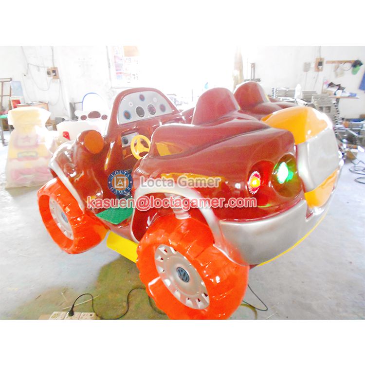 This is a can carry two children swing machine, the appearance is imitated off-road vehicles, temperament is not reduced. Children can also ride in the process, rotating the steering wheel in front of to achieve the effect of play. Turn on the power, put in a dollar coin, the controller will automatically count, the machine will swing back and forth, while playing nursery rhymes, while the button can be pressed, will emit eight sounds, the time (1-10 minutes adjustable) to automatically stop. To move, just lift one hand from the front, against the back of the two pulleys can be easily moved.