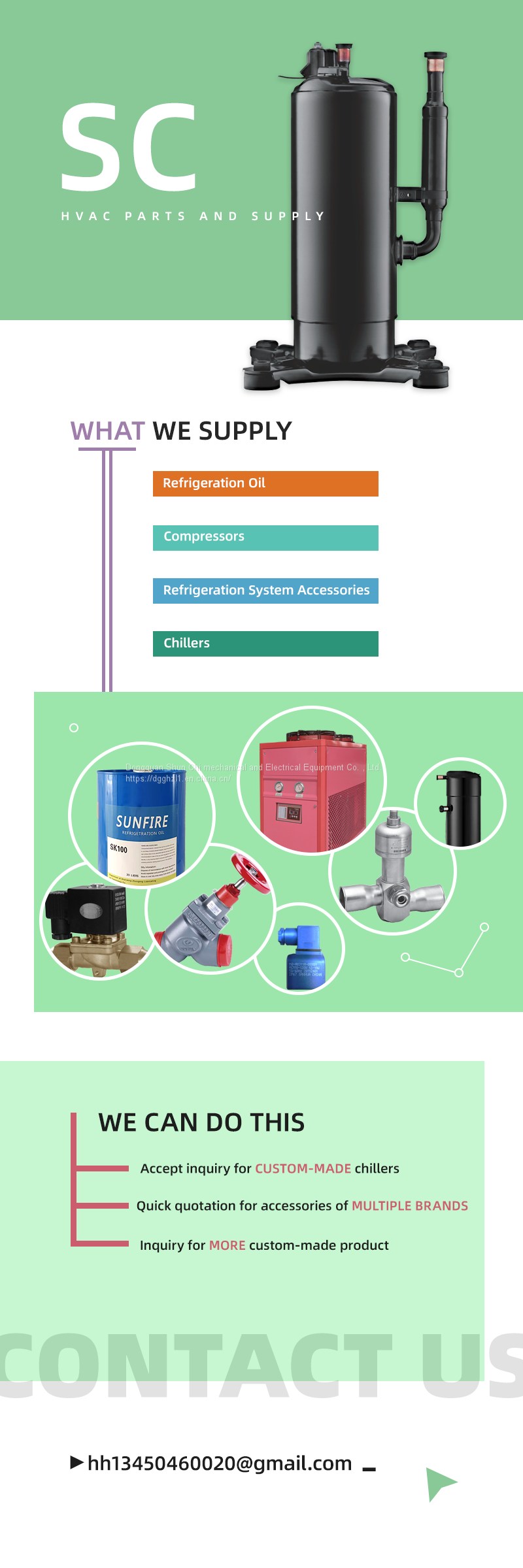 Dongguan Shun Chi mechanical and Electrical Equipment Co. , Ltd. is refrigeration equipment production, refrigeration installation and technical services integrated enterprise. Our company was established in 2000. Since company's inception, we have been continuously innovating and developing. Our aim is to grow into the world's high-quality refrigeration equipment and accessories manufacturer in China.Our main business are: the wholesale of foreign and domestic compressors and spare parts.We are trying our best to provide users with high-quality products and excellent services.?