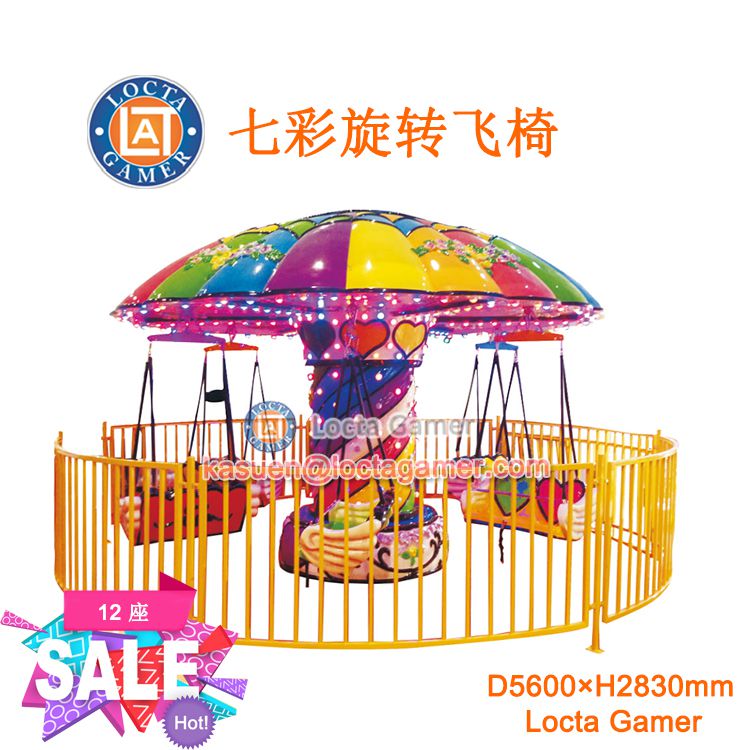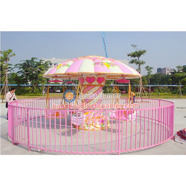 The overall appearance of the flying chair elegant, giving a romantic, warm feeling, every detail of the work are very exquisite. The ceiling is equipped with lights that flicker when rotating, making this product even more gorgeous. The whole set of glass fiber reinforced plastic with anti-cracking characteristics. The surface uses the high-grade automobile spray paint, the color is bright, is not easy to discolor. The operation of the machine using microcomputer control, easy to operate, covers a small area, is another ideal choice for mobile game equipment. After-sales guarantee, making this product popular with customers.