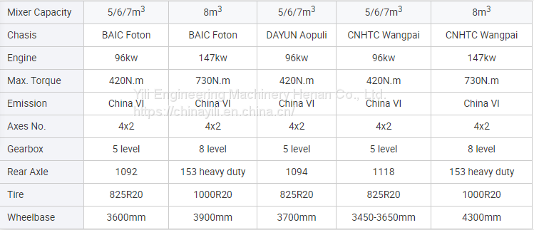 5/6/7/8m3 mixer drum are regular models. Smaller sizes 2-4m3 with 3-wheeled vehicle or 4-wheeled vehicle can be provided too.