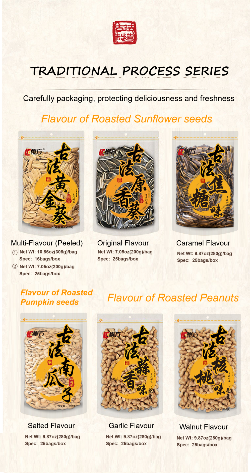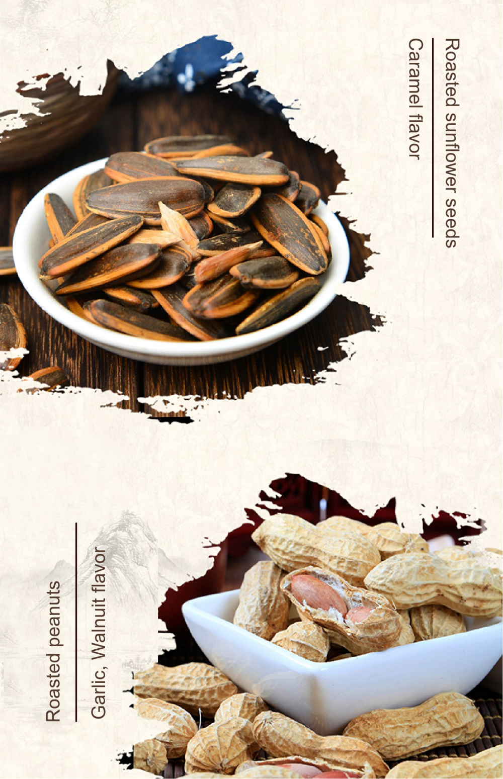 | Roasted sunflower seeds | Roasted peanuts | Roasted pumpkin seeds | Roasted watermelon seeds |