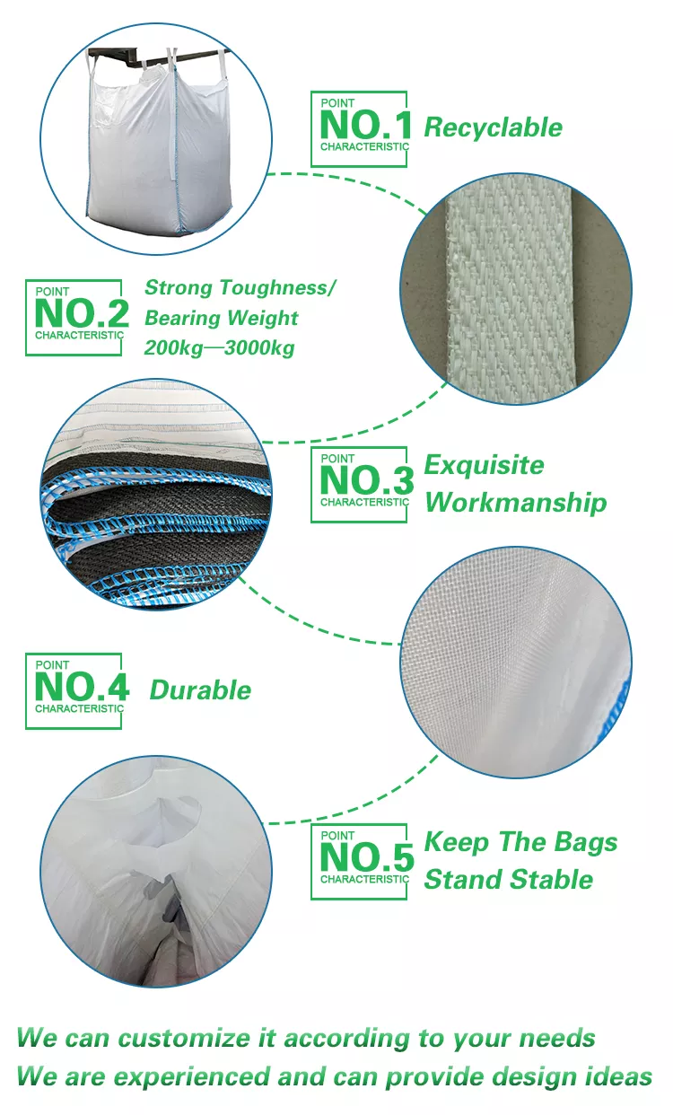 1 ton big bag are widely used in Chemicals, construction materials, plastic raw materials, Mineral products, Firewood,and other types of powder, granules, block goods packaging; And our company can also provide Food grade, Ventilated firewood, Baffle bag, conductive and UN bags.