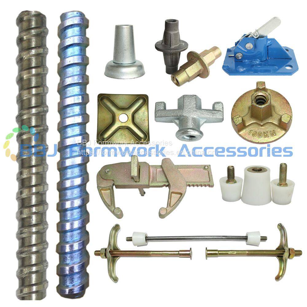 Various form tie rod system accessories available, such as steel tie rod, wing nut, water stopper, tie nut, washer plate, waller plate, hex nut, connection nut, etc.
