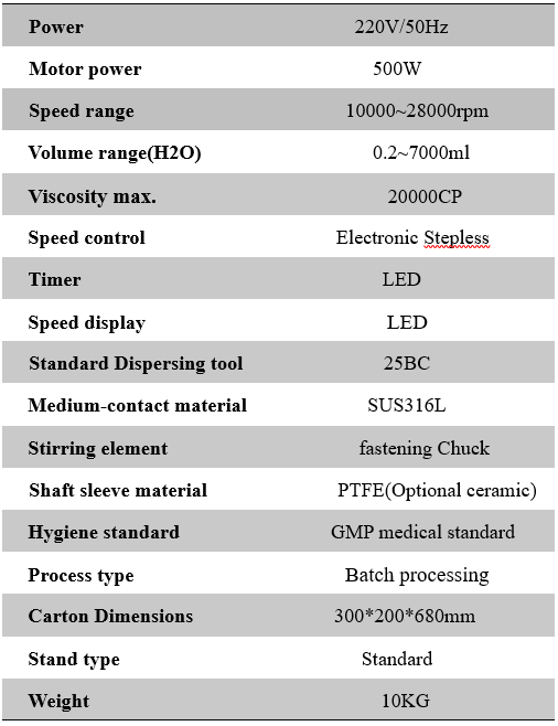 Suitable for multiple processes: homogenization / emulsification / depolymerization / dispersion / vaccine / fat milk / pesticides / yoghurt / textile auxiliaries / suspension / fruit juice / cell disruption / oil-water emulsification / coal slurry / cosmetics / asphalt / pigment / flavor / Tissue homogenate. M25-Digital laboratory high-shear emulsification machine has high efficiency, light weight, and complete machine module structure, which is easy to operate and can run for a long time, easily meeting various requirements.