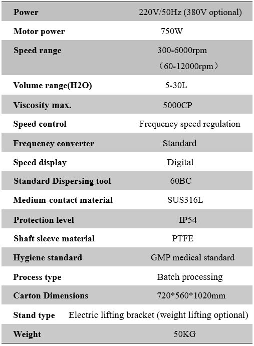 Laboratory pilot-type high-shear emulsifying and dispersing equipment, processing capacity range: 10-50L. It can accurately complete the simulated production from small trials to industrialization, providing a basis for inspecting production processes and selecting large production equipment. With high speed motor, frequency conversion speed regulation, digital display, electric upgrade and other functions