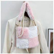 038New Style Plush Bag Splicing Elements Pearl Strap Shoulder Straddle Handbag for Women