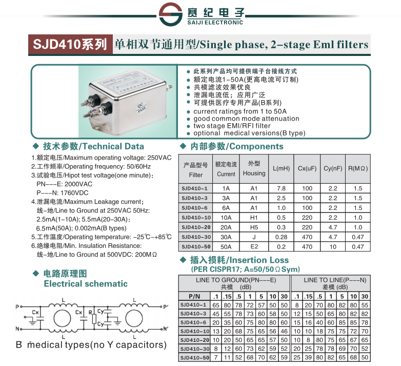 --The SJD410 420 430 series adopts a two-stage common mode filtering design, and the overall filtering effect is basically the same, with slight differences only based on different currents