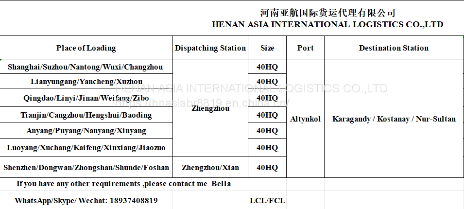 Transportation of Cargo , From China to Karagandy / Kostanay / Nur-Sultan 1 (Astana 1)