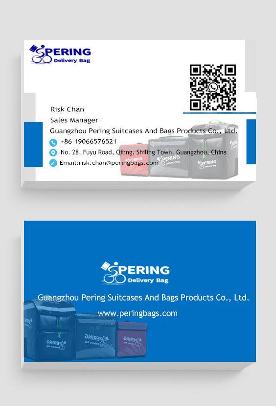 "We are Guangzhou Pering Suitcases And Bags Products Co., Ltd., a factory based in Huadu, Guangzhou, China, conveniently located near the airport. Specializing in manufacturing delivery bags for various food delivery services, we offer customized solutions for delivery groups and supply to various small and medium-sized sellers, including Amazon. We welcome you to visit our factory!" what(sapp) 86 19066576521