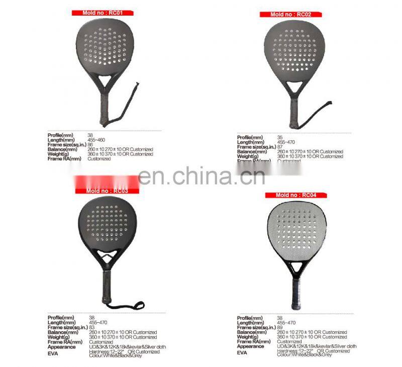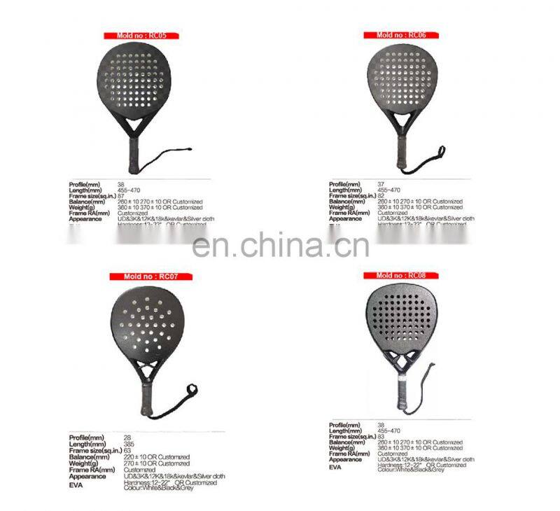 You can choose different materials (fiberglass, all carbon, 3K, 12K, 18K) and print your own logo on the racket.