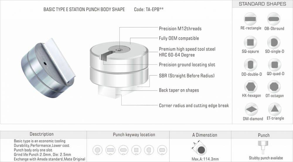 | Basic type is fully compatible with OEM popular series,Amada ,Mate original,Wilson metric.Best ecomonic type,save big cost.An economic ,Durablity,Performance,Lower cost type | FAB type is a better tooling,Durability,Performance,Long grinding life,Quick adjust,Compatible with amada punch,Exchange with NEX,Quickadjust,Rapidset,No need tools to adjust punch | FAB 90 type is a best tooling Durability, Performance,Grind life punch:6.0mm,Exchange with Wilson S90 series,Quickly adjust, no need tools to adjust |