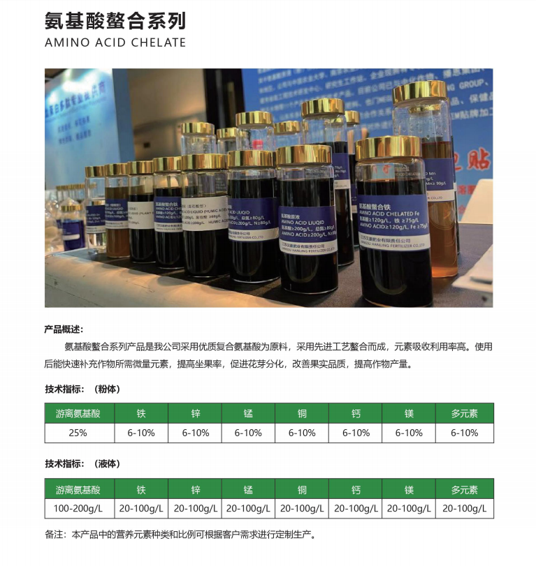 Using high quality compound amino acid as raw material by advanced chelating technology and the aborption rate of trace elements is high.After use,it can quickly suppplement the microelements needed by crops,improve fruit setting rate,promote flower bud differentiation,increase flavor substances and improe taste.