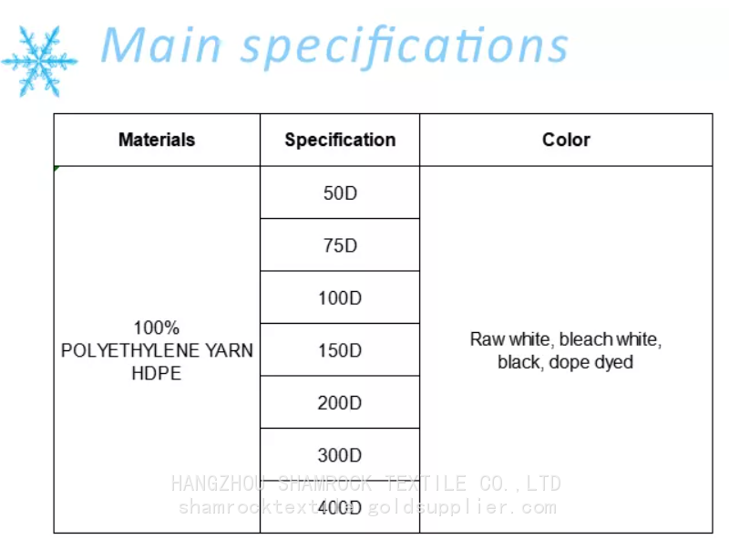 | Strength | 2.58 CN/DTEX | Yarn Count | 50D,75D,100D,150D,200D,300D,400D | |