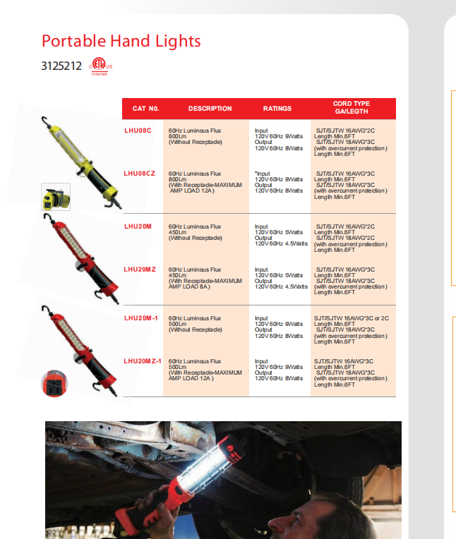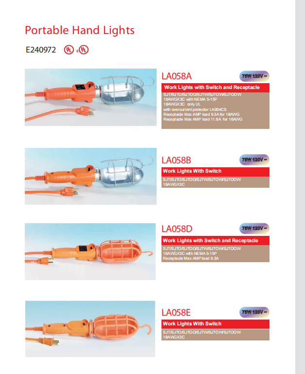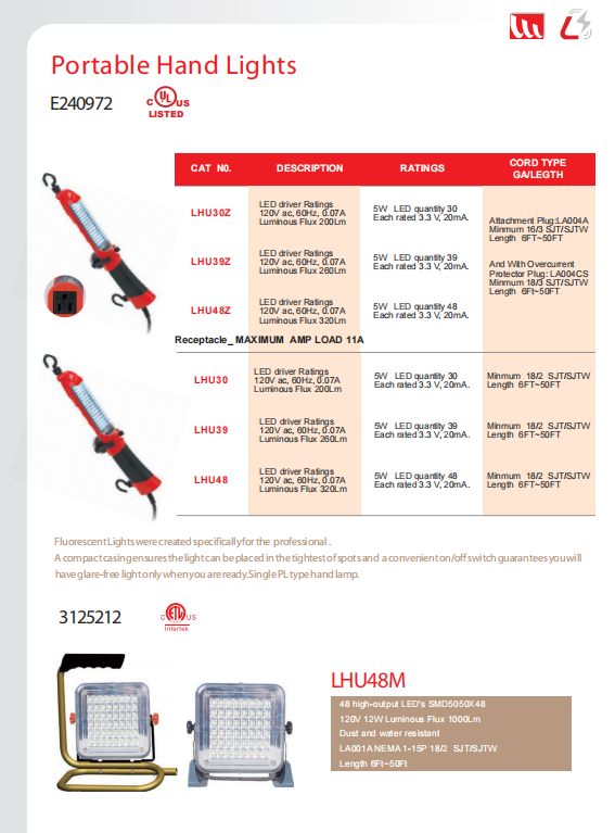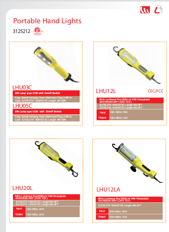 Portable Electric Hand Lamps (UL/CUL File NO. E240972) (ETL/CETL 3125212)