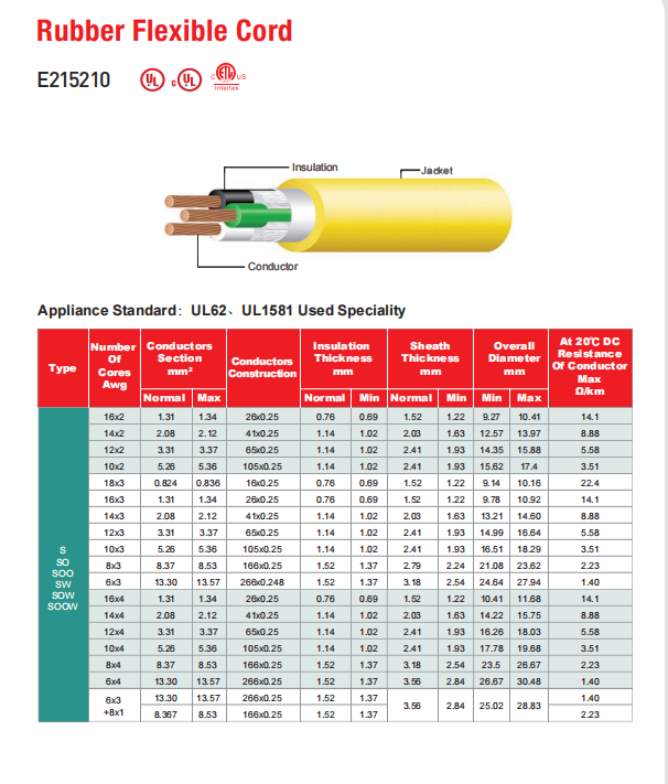 SOOW SOW SW SOO SO S 600V Rubber Flexible Cord UL62 UL1581 Standard