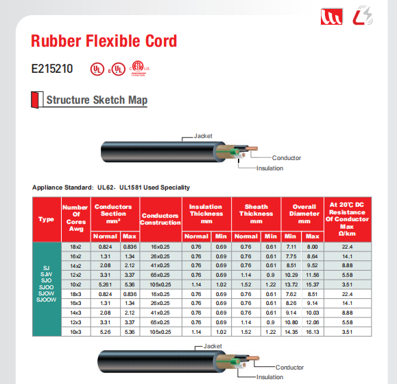 SJOOW SJOW SJW SJ SJO SJOO 300V Rubber Flexible Cord UL62 UL1581 Standard