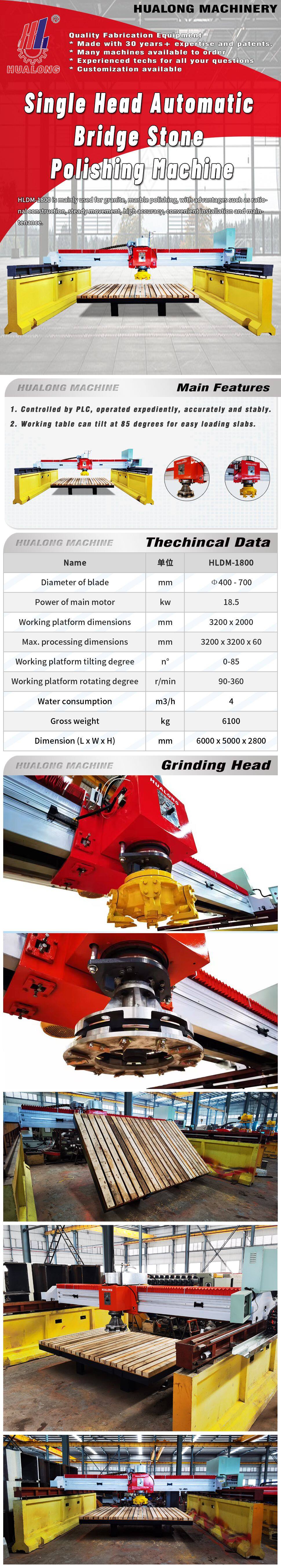 HLDM-1800 is mainly used for granite, marble polsinging, with advantages such as rational construction, steady movement, high accuracy, convenient installation and maintenance.