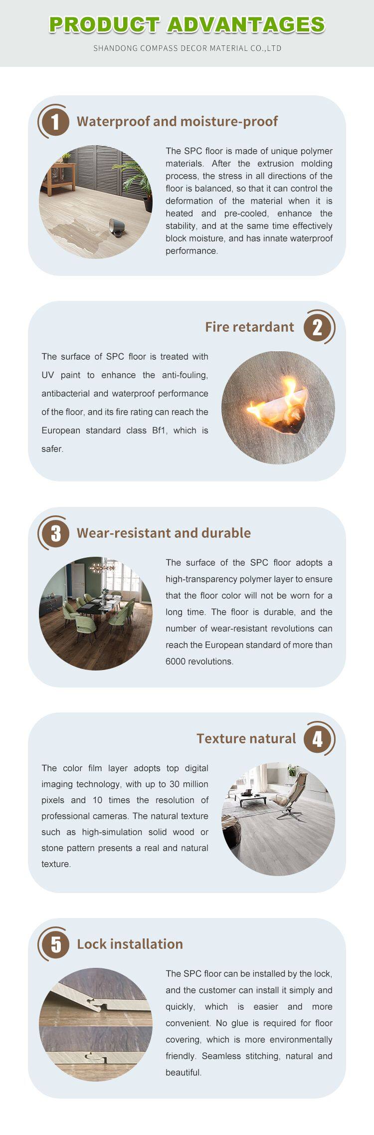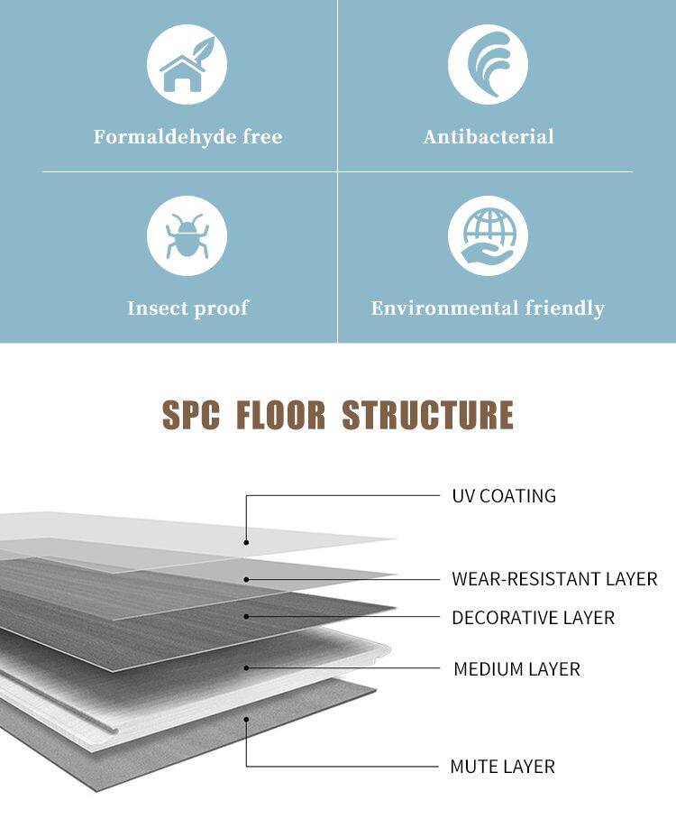 SPC flooring works well both for commercial and residential spaces.UV coated wear layer makes it resistant to scratches and stains under daily wear. With a unique click system and edge design, SPC vinyl planks are connected seamlessly and tightly without glue.The flooring installation can be faster and easier. it look more realistic.