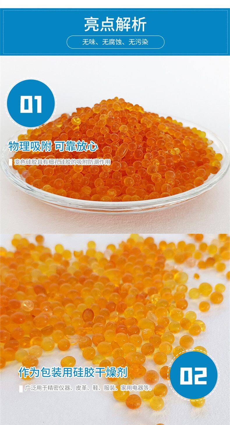 The research and development of the product is based on blue rubber color-changing silica gel, which is made of orange color-changing silica gel by dyeing the inorganic salt mixture. It adopts a new non-toxic compound dyeing agent, which fundamentally eliminates the pollution caused by dyeing agent and color-changing agent to the environment. The product has become a new generation of environmental protection products with its original technological conditions and good adsorption properties.