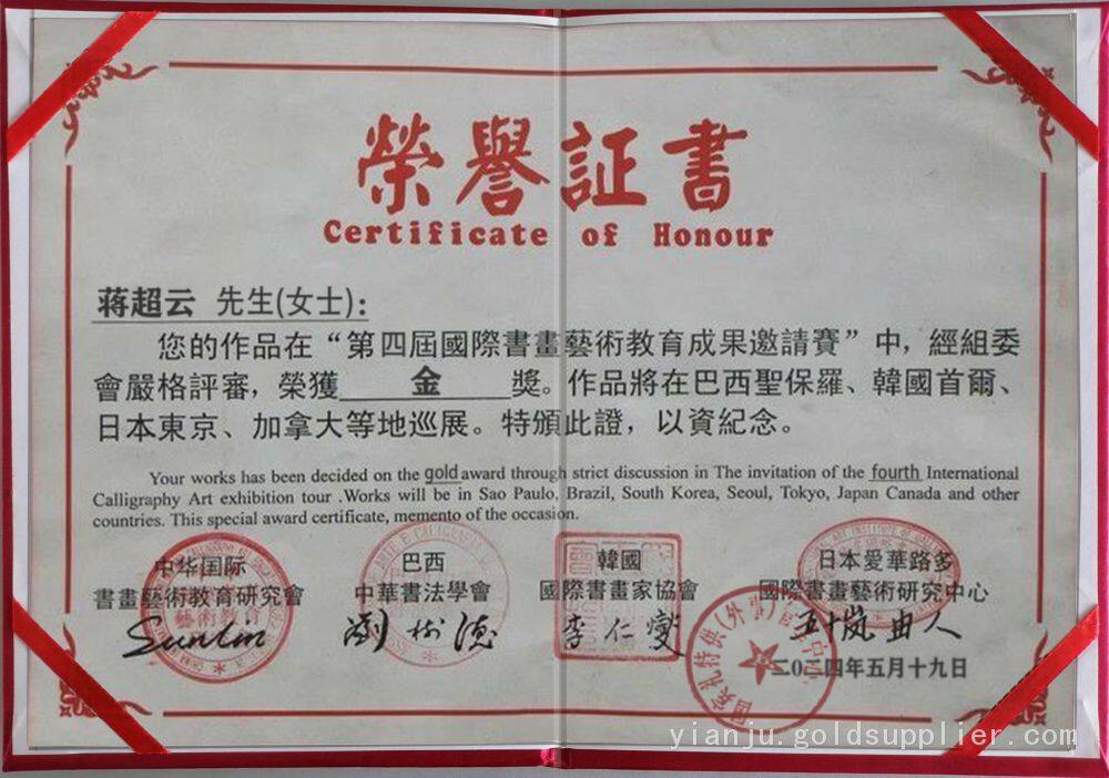 This works has been decided on the gold award through strict discussion in the invitation of the international calligraphy are exhibition. The work have been exhibited in Sao Paulo, Brazil, South korea,Seoul, Tokyo, Japan, Canada and other countries.
