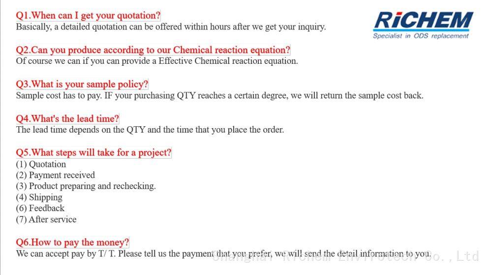 Shanghai Richem Company is a professional company engaged in ODS (Ozone-Depleting Substances) replacement, committed to CFCs&HCFCs series of products alternative technical services and sales services. The main business is the promotion and technical support of environmental protection products, including CFCs&HCFCs replacement refrigerants, environmental protection cleaning agents, plastic additives, etc. Acting for a number of some world-famous companies related products. In the precision cleaning alternative technology, we have independent research and development capabilities to provide customers with comprehensive CFCs&HCFCs alternative solutions, as well as comprehensive chemical supply solutions.