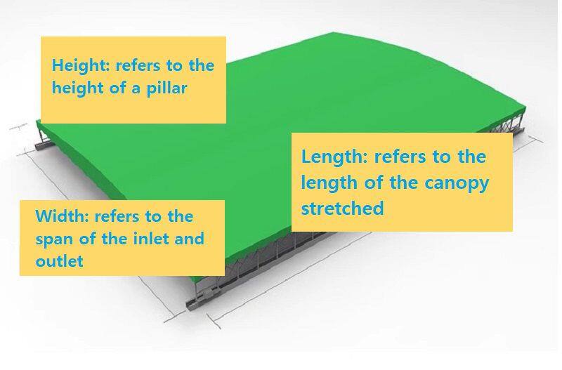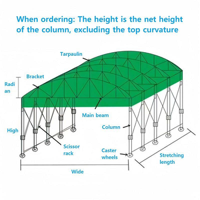 2. When placing an order, calculate based on the top unfolded area and charge according to square meters. Because the front and rear tarpaulins will hang down by 1 meter and 0.5 meters on both sides, the specific calculation method should be based on: (length+2m) * (width+1m) * unit price=total amount, and the standard cost should be calculated according to this method. If the unit price is $8/㎡, then assuming a mobile retractable canopy with a height * length * width of 2.5 * 6 * 3m, the calculated cost is: (6+2) * (3+1) * $8/㎡=$256.
